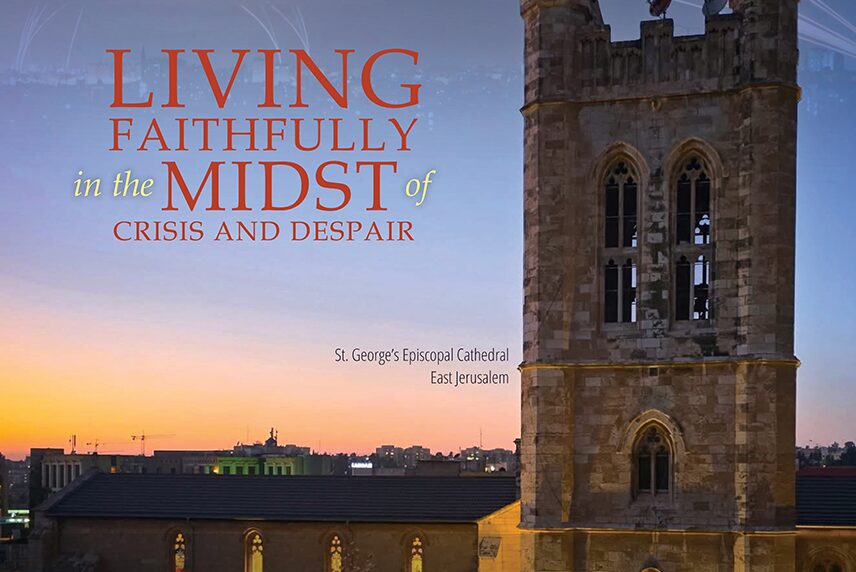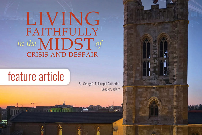 The cover features an image of St. George’s Episcopal Cathedral in East Jerusalem, taken by Don Binder during a missile warning. In the distance, a separate Getty Images photograph shows missiles arcing through the sky on one side and Israel’s interceptors on the other. Though appearing as a single scene, these are two different images combined to reflect the reality of life in Israel — including for those who live on and near the Episcopal Cathedral grounds — during a time when people were forced to take cover because of missile fire.