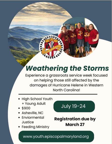 Join Youth from Marylandon a Service Trip to North Carolina REGISTRATION CLOSES MARCH 27 The youth team from the Diocese of Maryland invites all youth of Province III to join them on a meaningful service trip to Western North Carolina this summer. Spend a week making a real difference in communities still recovering from the impact of Hurricane Helene in 2024. The trip begins on Sunday, July 19, with travel to Black Mountain, North Carolina, where participants will settle into dormitories at a local university. From there, the week will be filled with hands-on service projects to help rebuild and support the local communities. - More information, click here.
